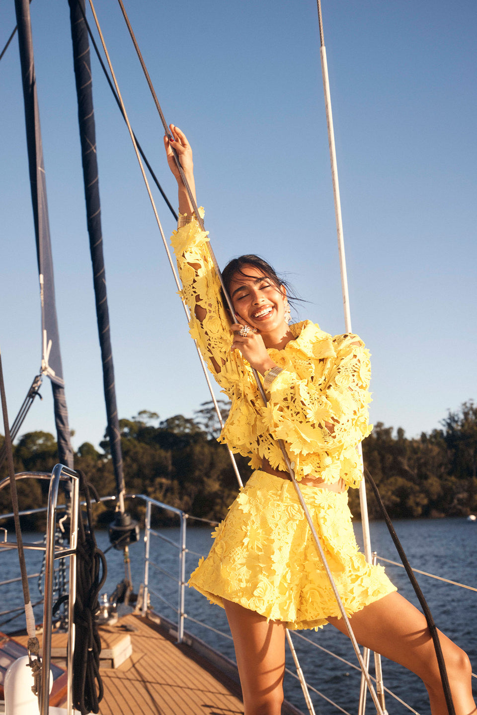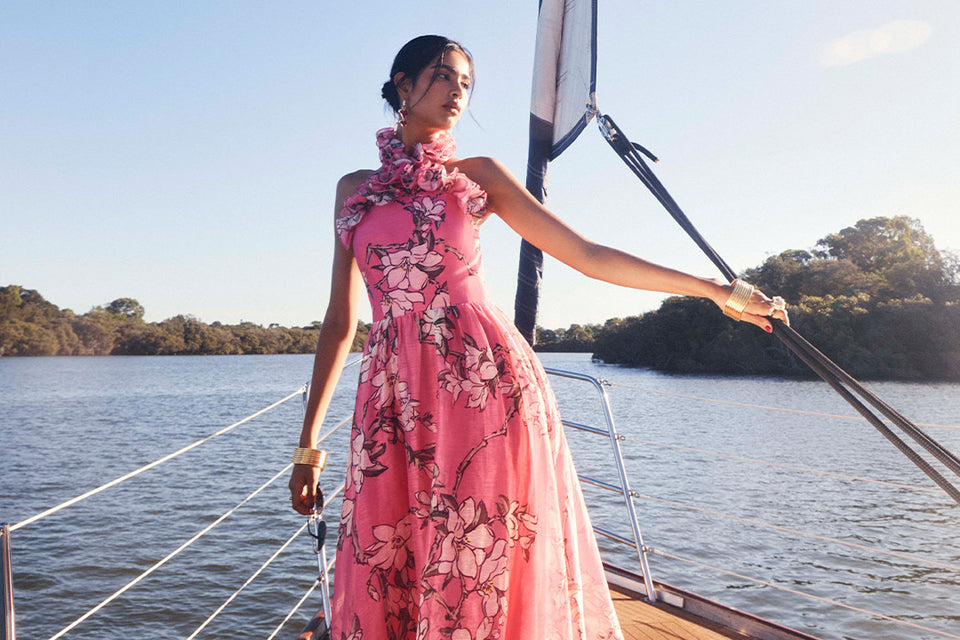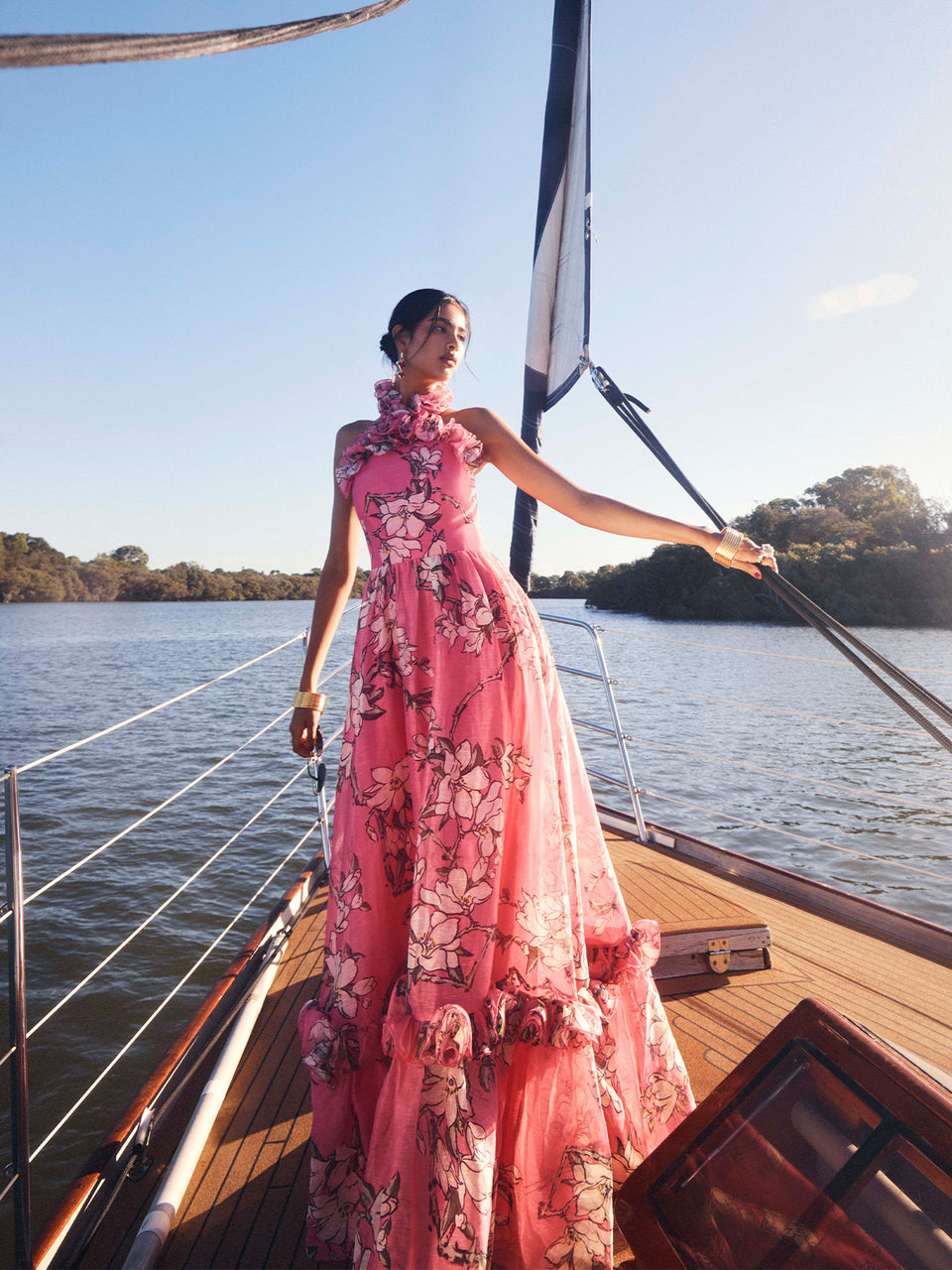 Isabelle Ruffled Hatlerneck Maxi Dress - Pink Magnolia Print