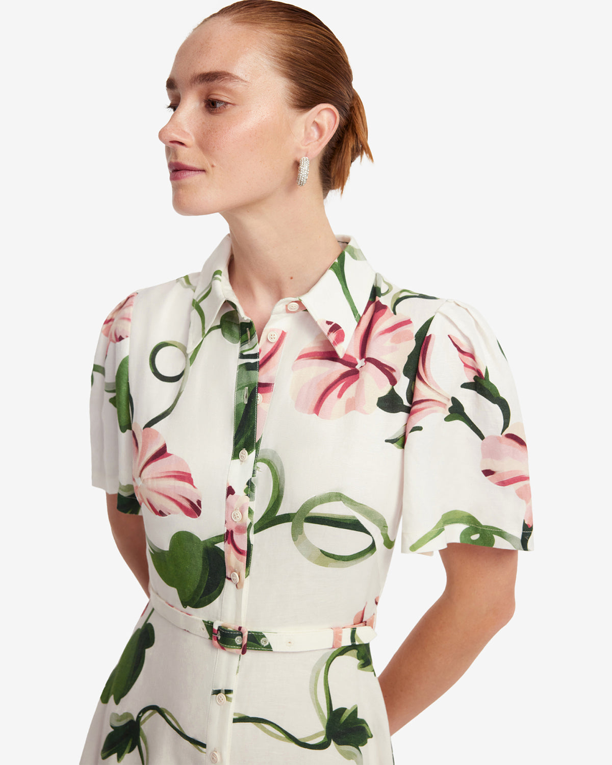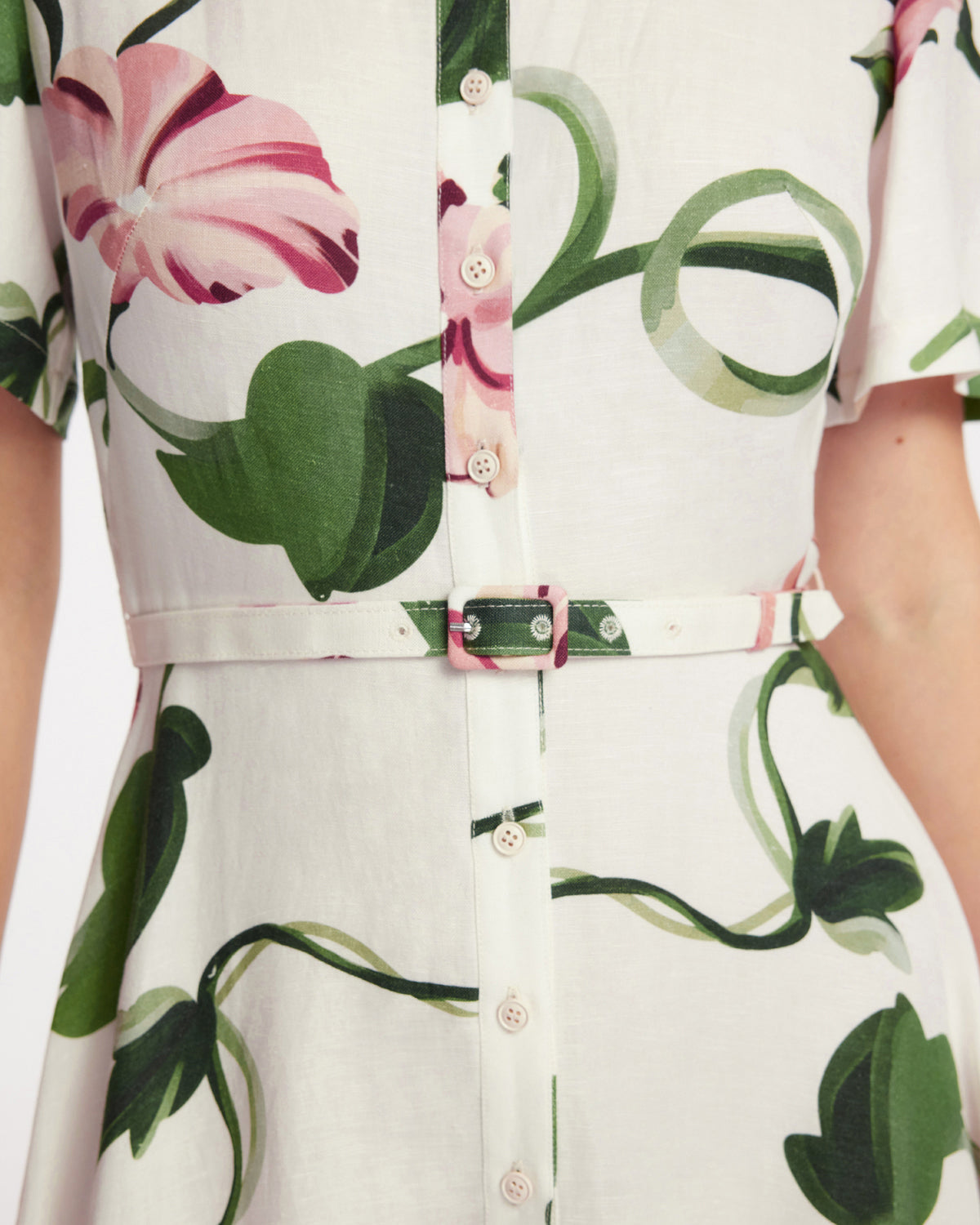 A matching fabric belt cinches the waist for a flattering silhouette while seamlessly blending into the floral design.