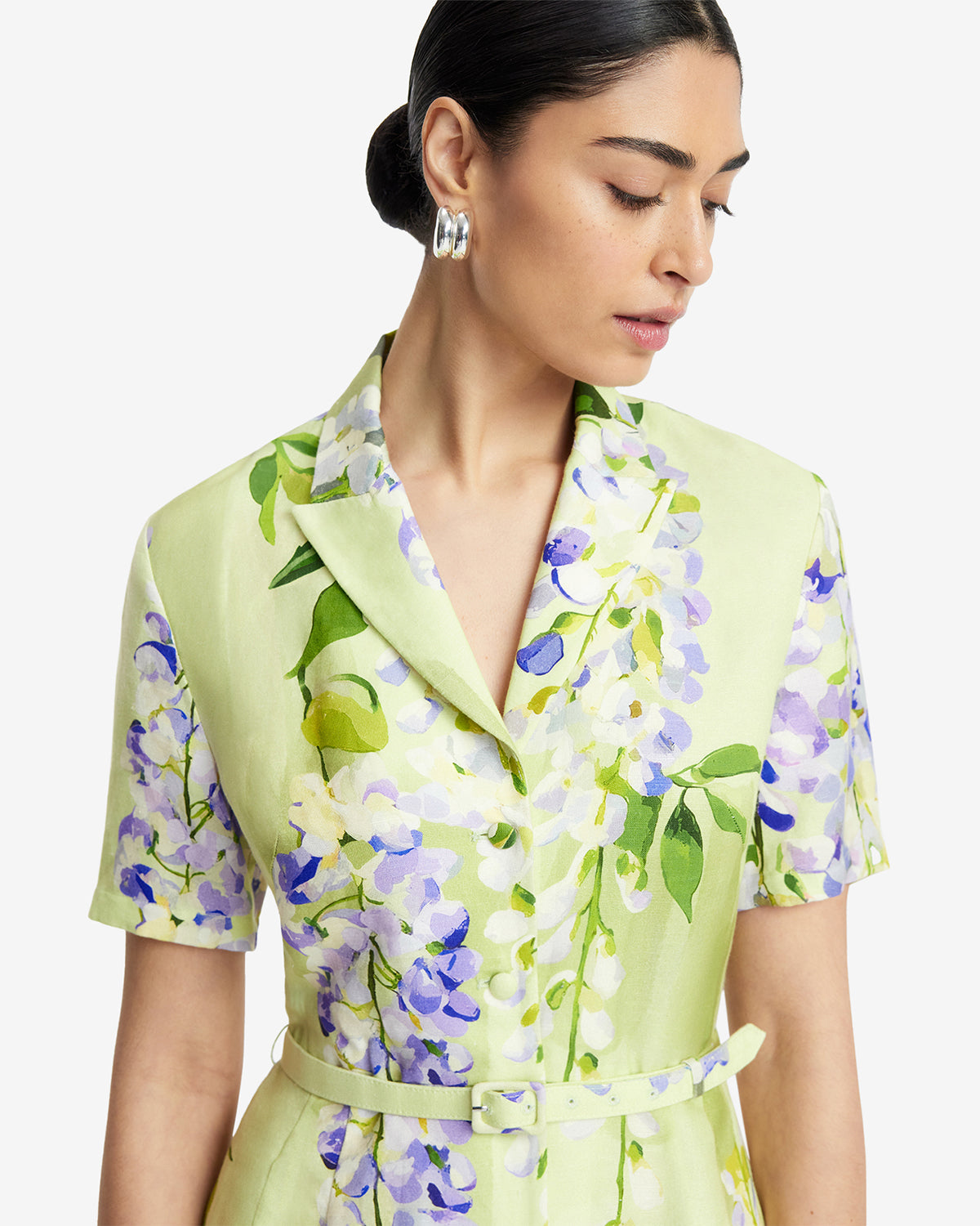 A cascading lilac dream! These beautiful lilac wisteria blooms tumble down a soft lime canvas. This print evokes pure fresh air, and feels like floating through a tranquil, sun-drenched garden on the first day of spring.