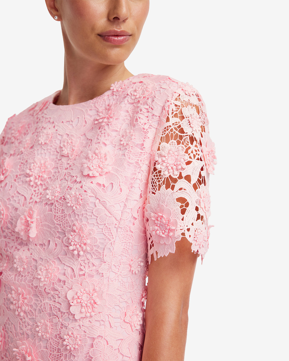 Crafted in a blush pink, this intricate floral lace brings a fresh, feminine feel with an elegant and romantic touch.
