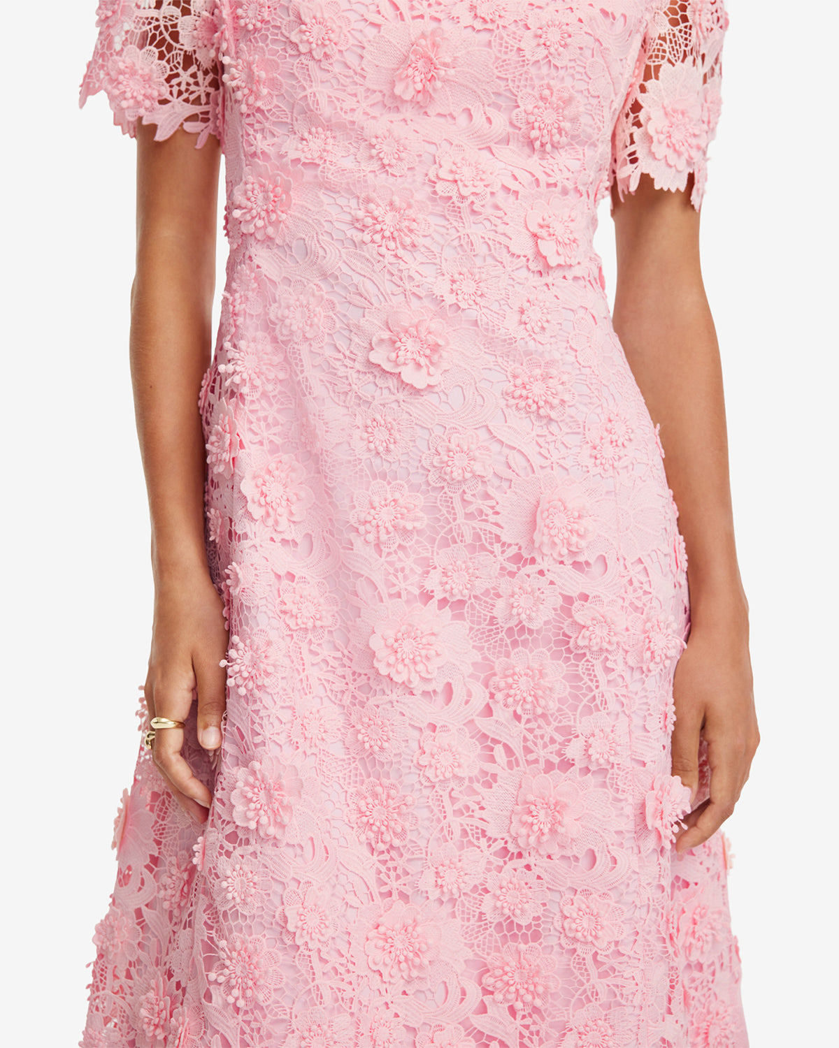 The A-line skirt creates a flattering silhouette, adding graceful movement while showcasing the all-over floral lace.