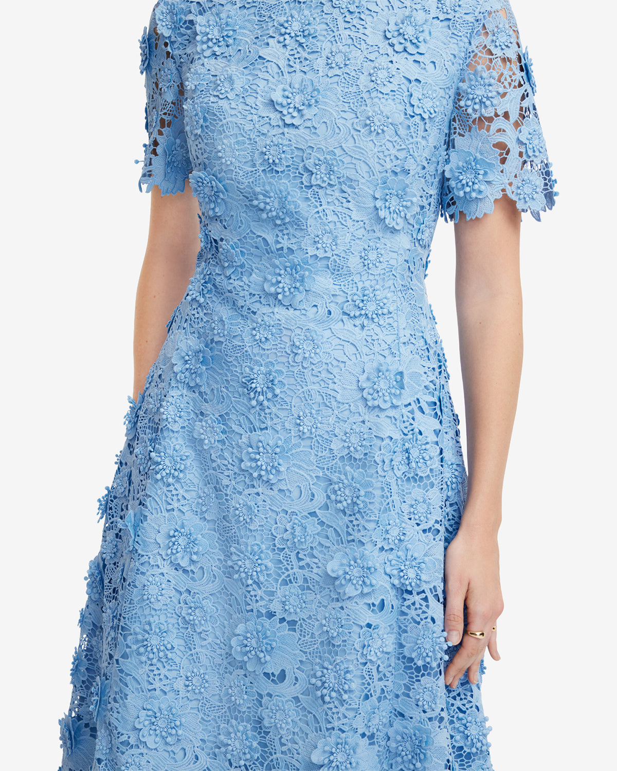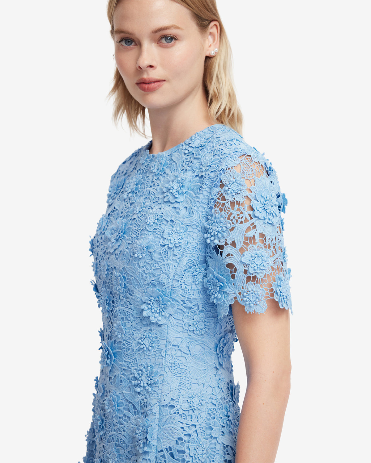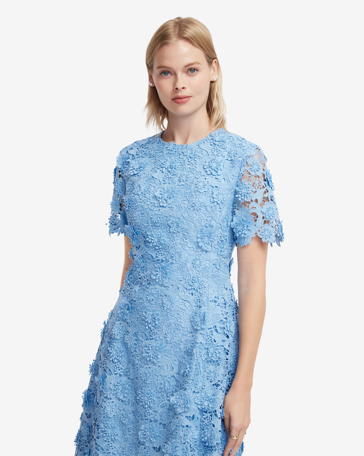 The A-line skirt creates a flattering silhouette, adding graceful movement while showcasing the all-over floral lace.