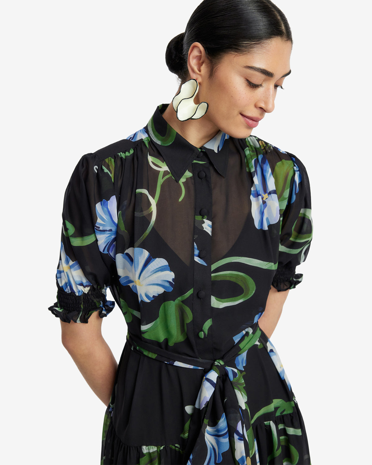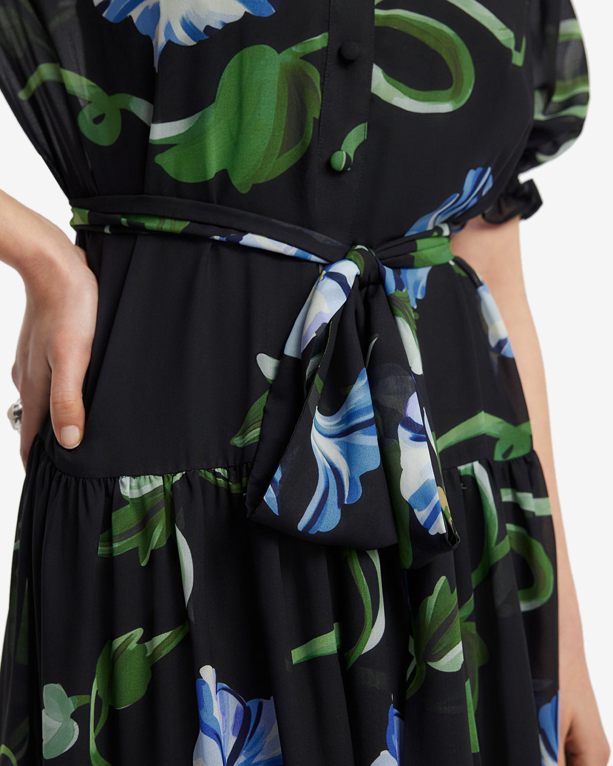 A matching fabric belt to cinch the waist for a flattering silhouette while seamlessly blending into the floral design.