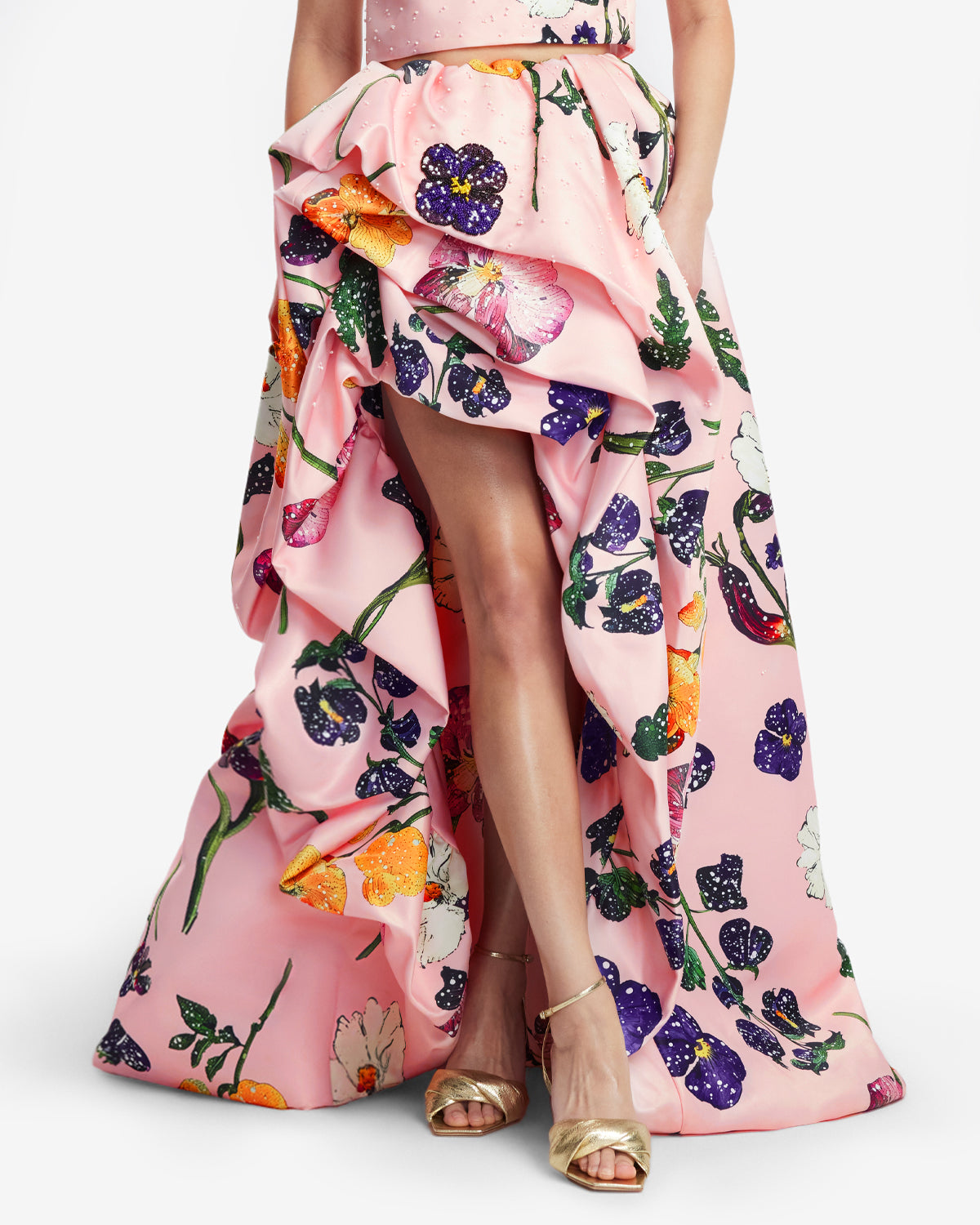 A playful scattering of detailed wildflowers in vibrant purple, orange, and white bloom across a delicate pink base. Sparkling, intricate, and bursting with whimsical charm.