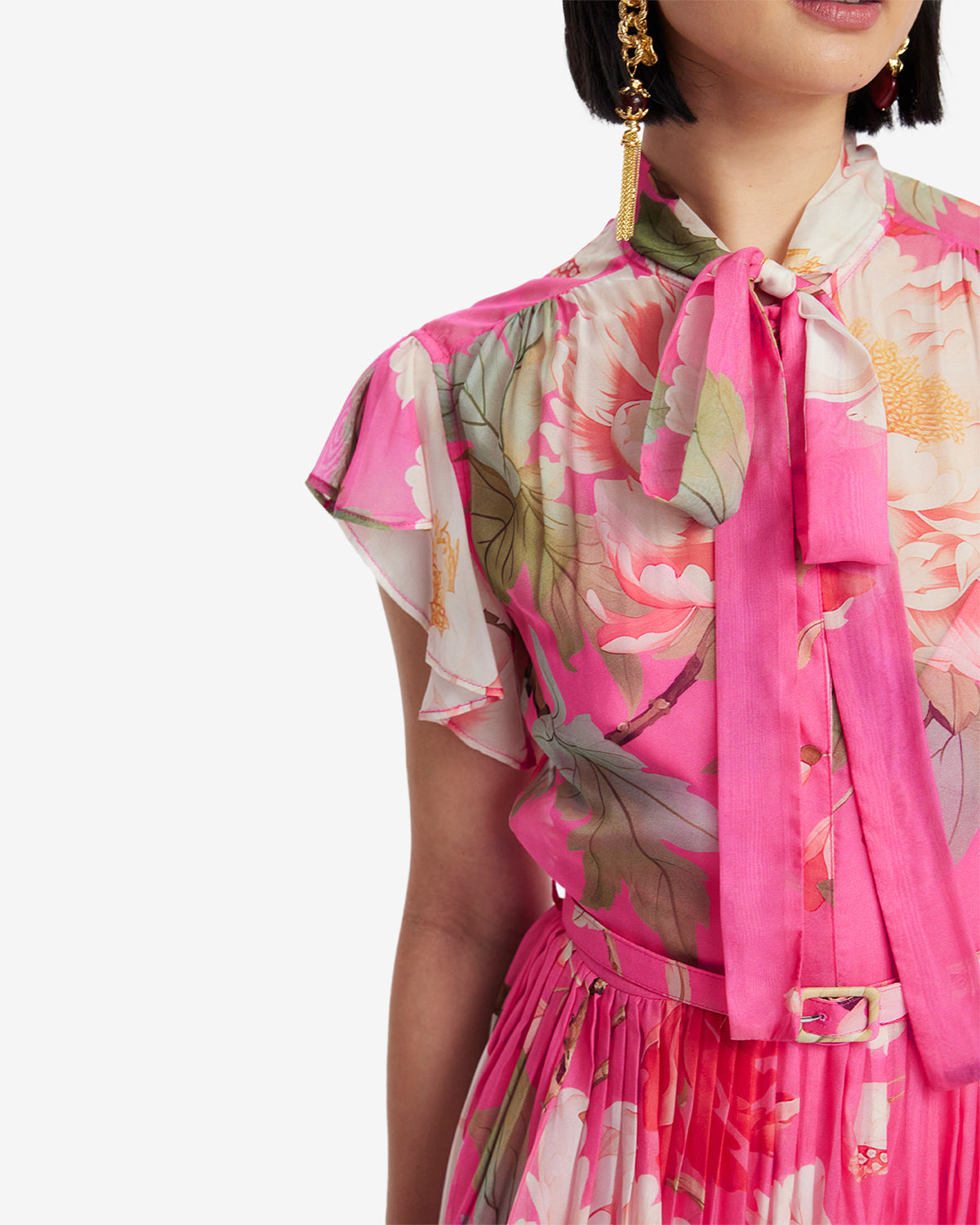 A matching fabric belt cinches the waist for a flattering silhouette while seamlessly blending into the floral design.