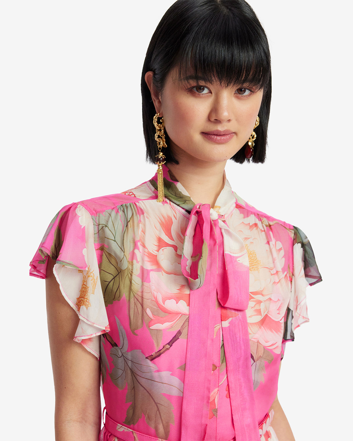 Flutter sleeves float delicately, creating movement and a light, airy silhouette.
