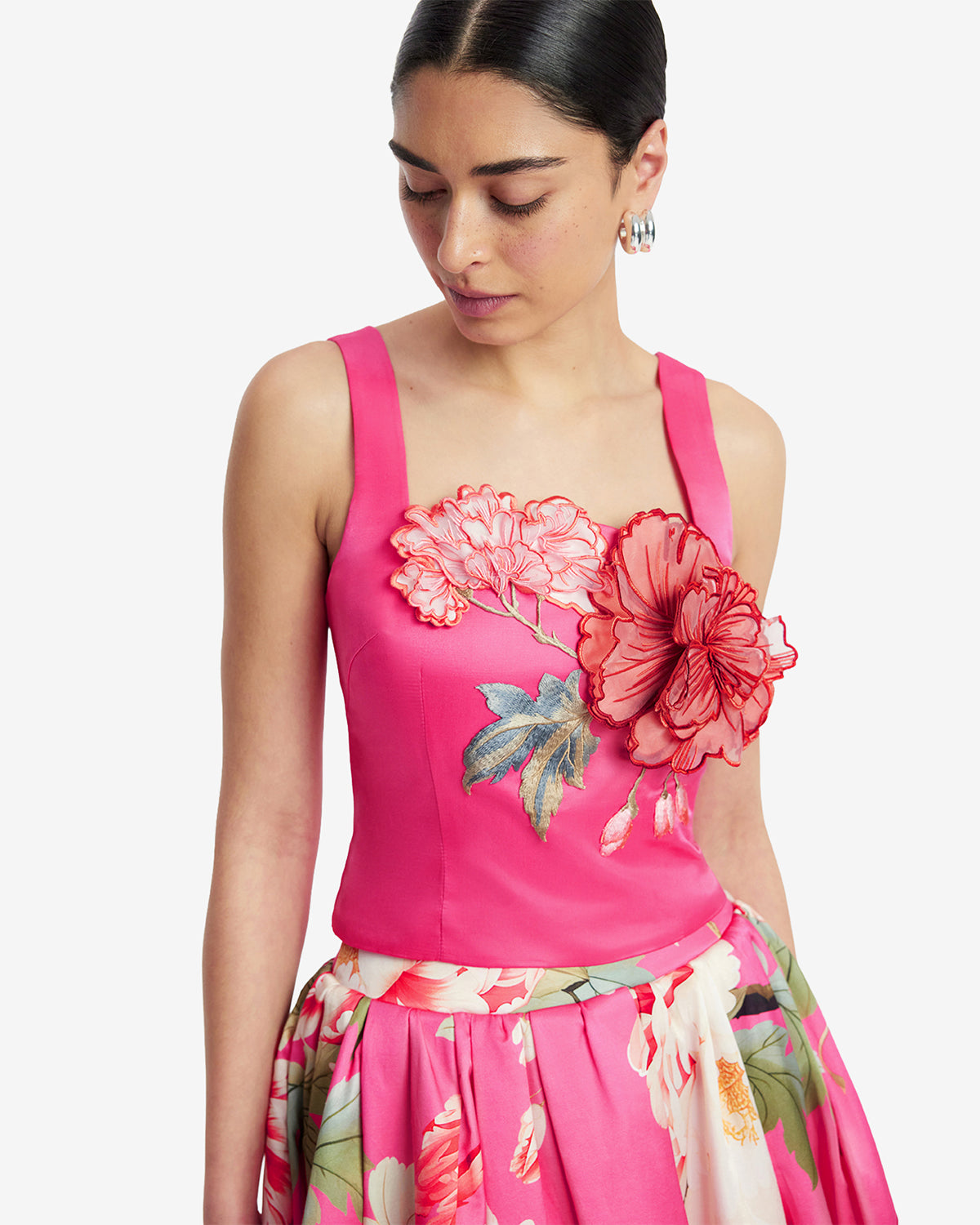 Elegant, painterly peonies in shades of cream and bright red bloom across a striking fuchsia canvas. It’s a statement, it’s romantic, and it’s perfectly dramatic.