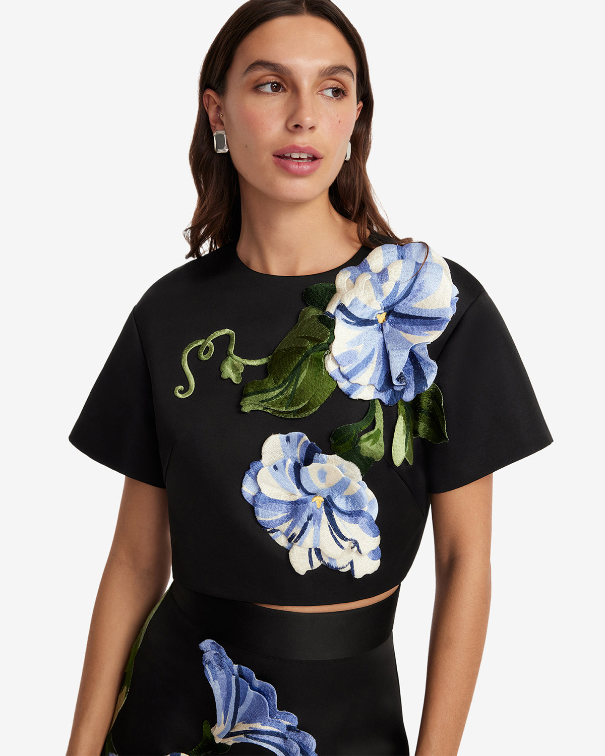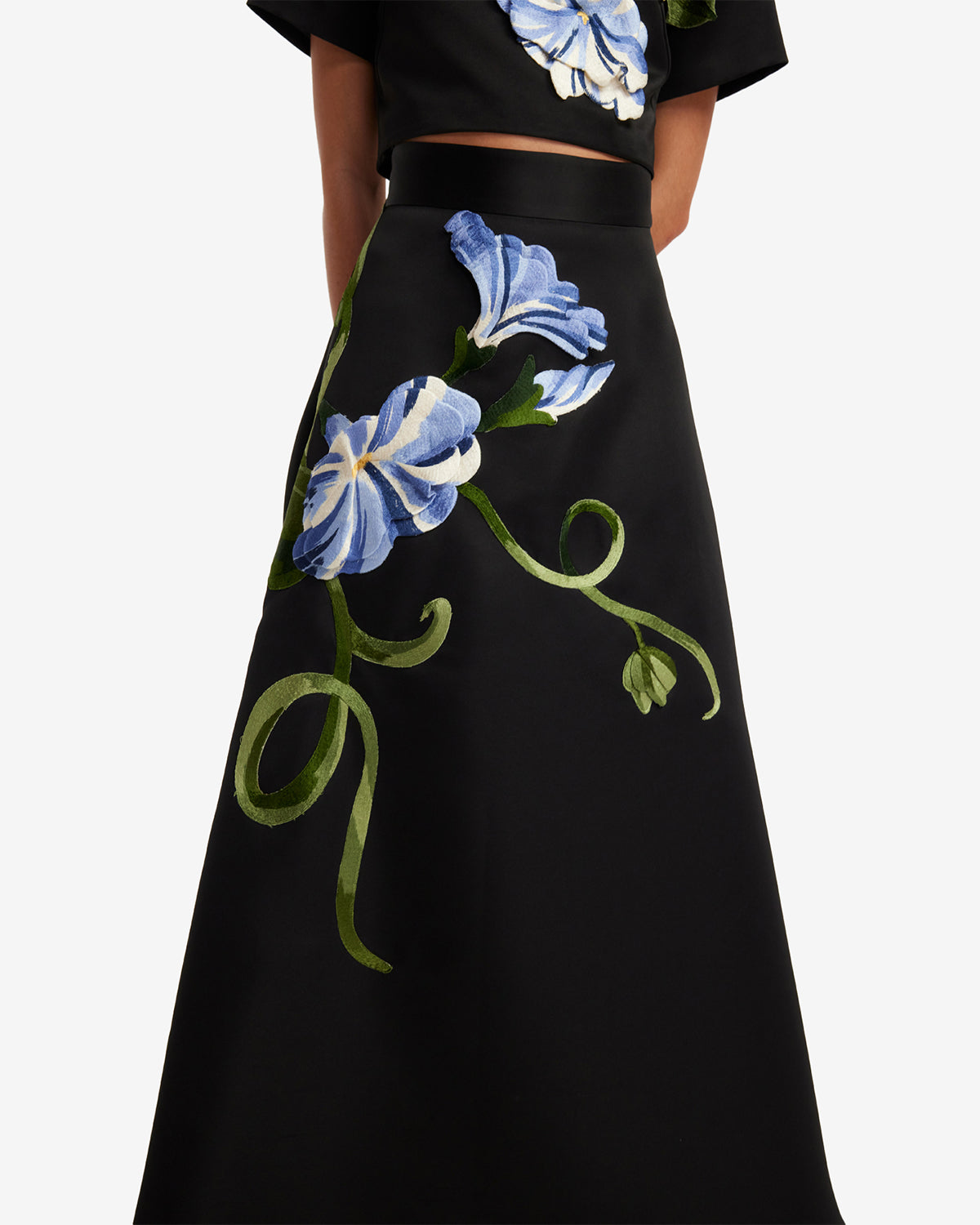 Each floral embroidery is individually cut and artfully reassembled into intricate clusters, creating a richly textured design.