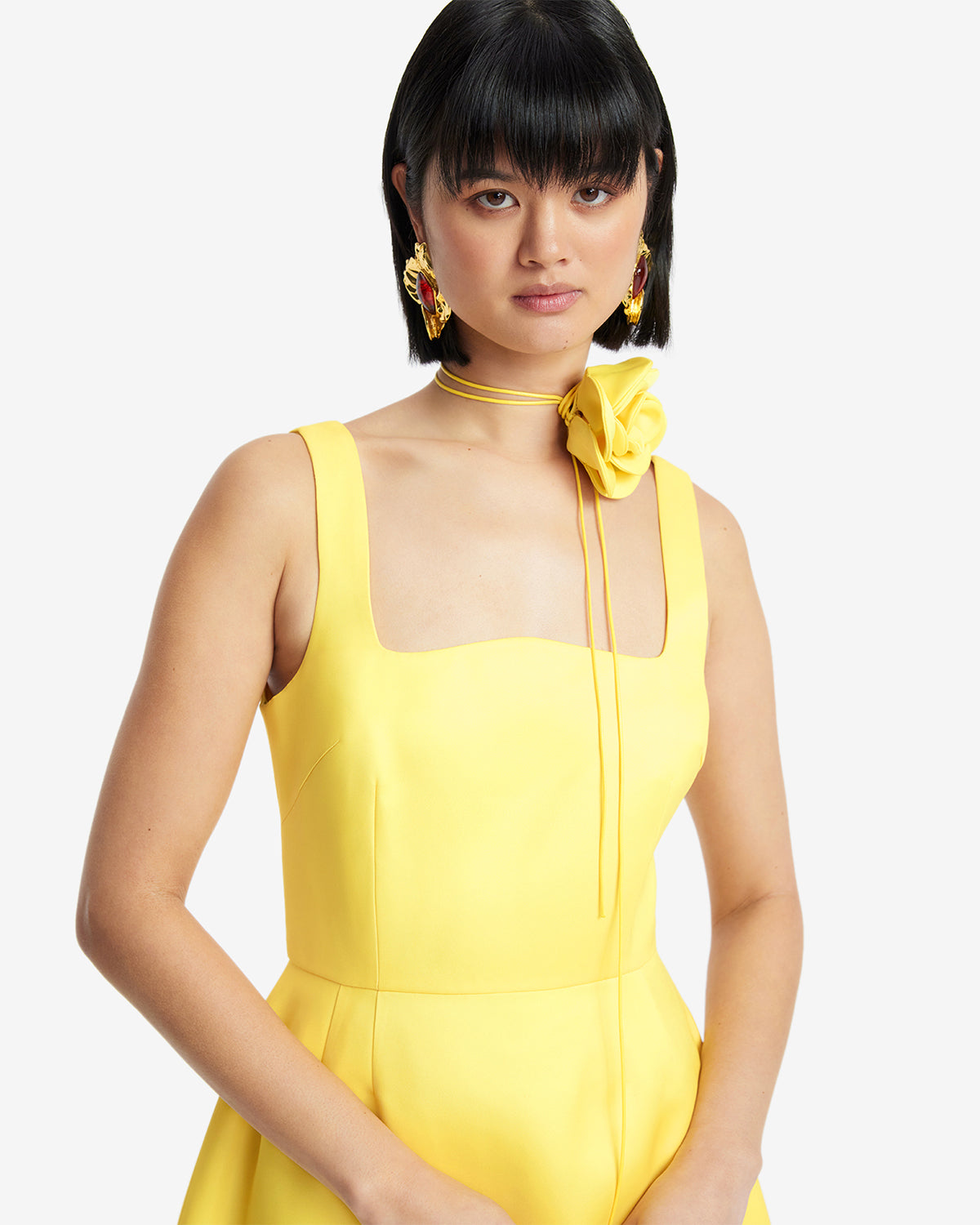 The square neckline offers a beautifully framed silhouette, highlighting the collarbone with timeless elegance.