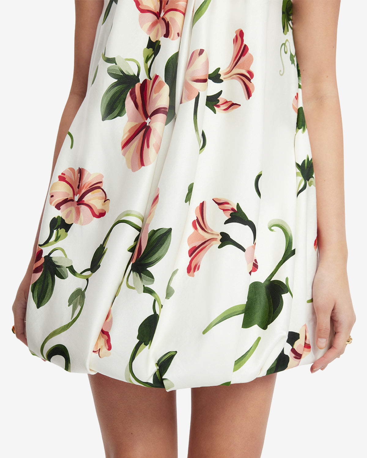 The bubble silhouette introduces voluminous charm, refined by soft pleats for a structured finish.
