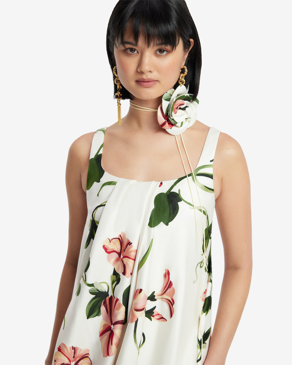 A matching fabric floral neck tie adds a beautifully cohesive finish, bringing soft elegance to the neckline.