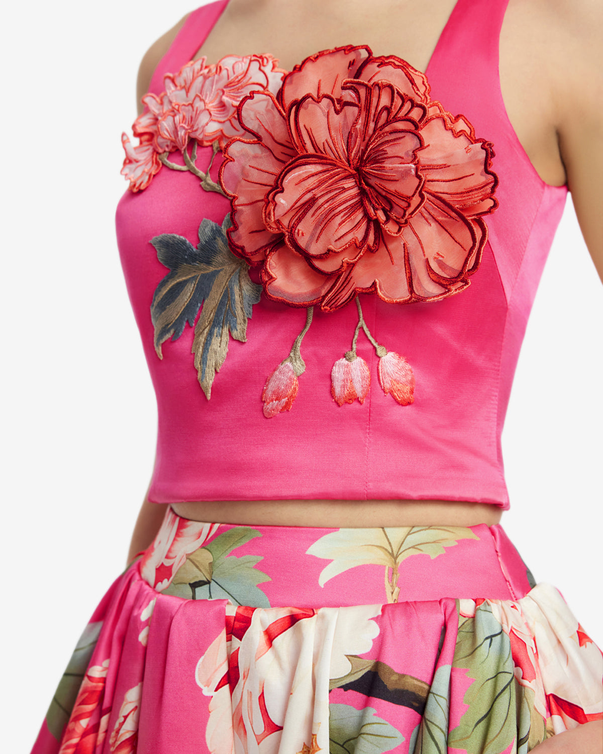 Elegant, painterly peonies in shades of cream and bright red bloom across a striking fuchsia canvas. It’s a statement, it’s romantic, and it’s perfectly dramatic.